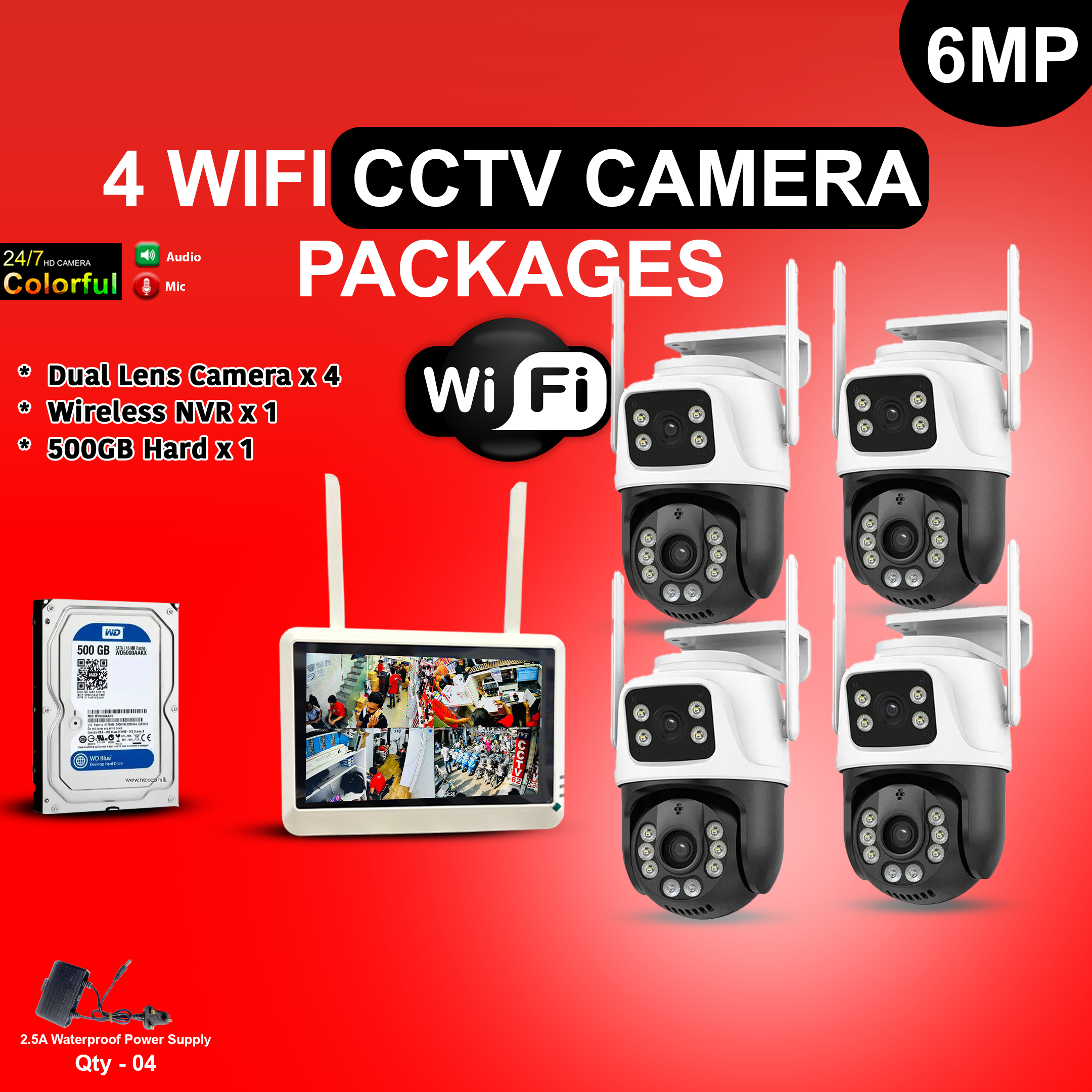 6MP Dual Lens PTZ Outdoor 4 Camera Pack with Display NVR, Hard Disk, Power Supply Full Wireless Camera Package