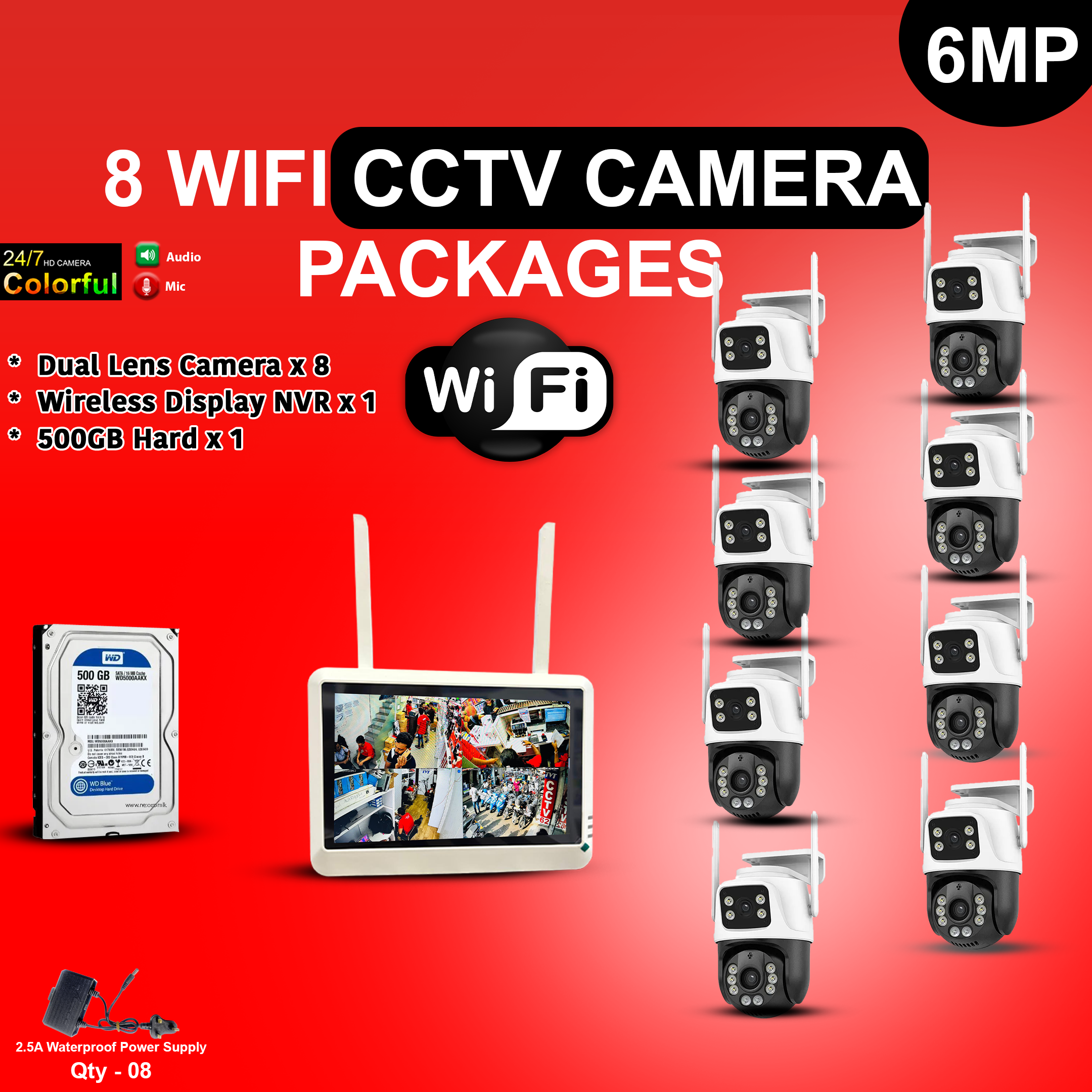 6MP Dual Lens PTZ Outdoor 8 Camera Pack with Display NVR, Hard Disk, Power Supply Full Wireless Camera Package