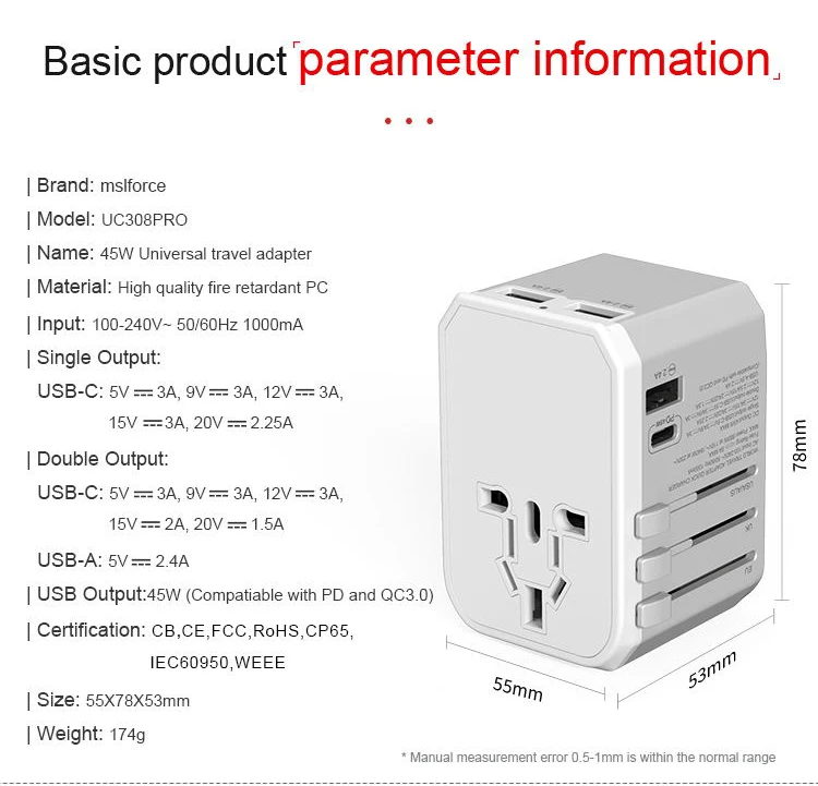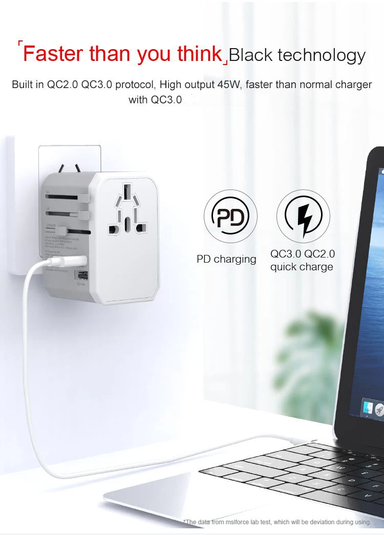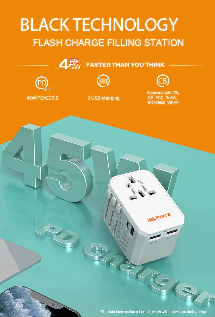 Here , you should have a universal travel adapter with 45W TYPE-C PD charger with imprinted logo MSLFORCE free shipping , fast shipping , good quality and money back guarantee.
