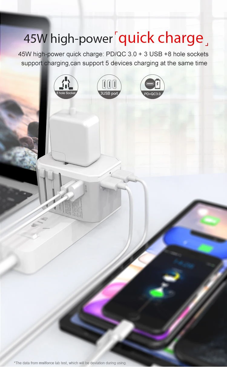 USB TYPE-C 45W PD universal travel adapter with 3 Port USB A Charger