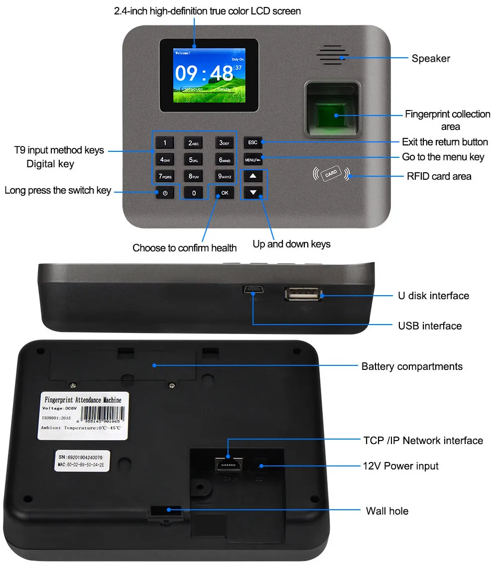 4. 3 methods to identify the attendance: Fingerprint, Password, RFID card.