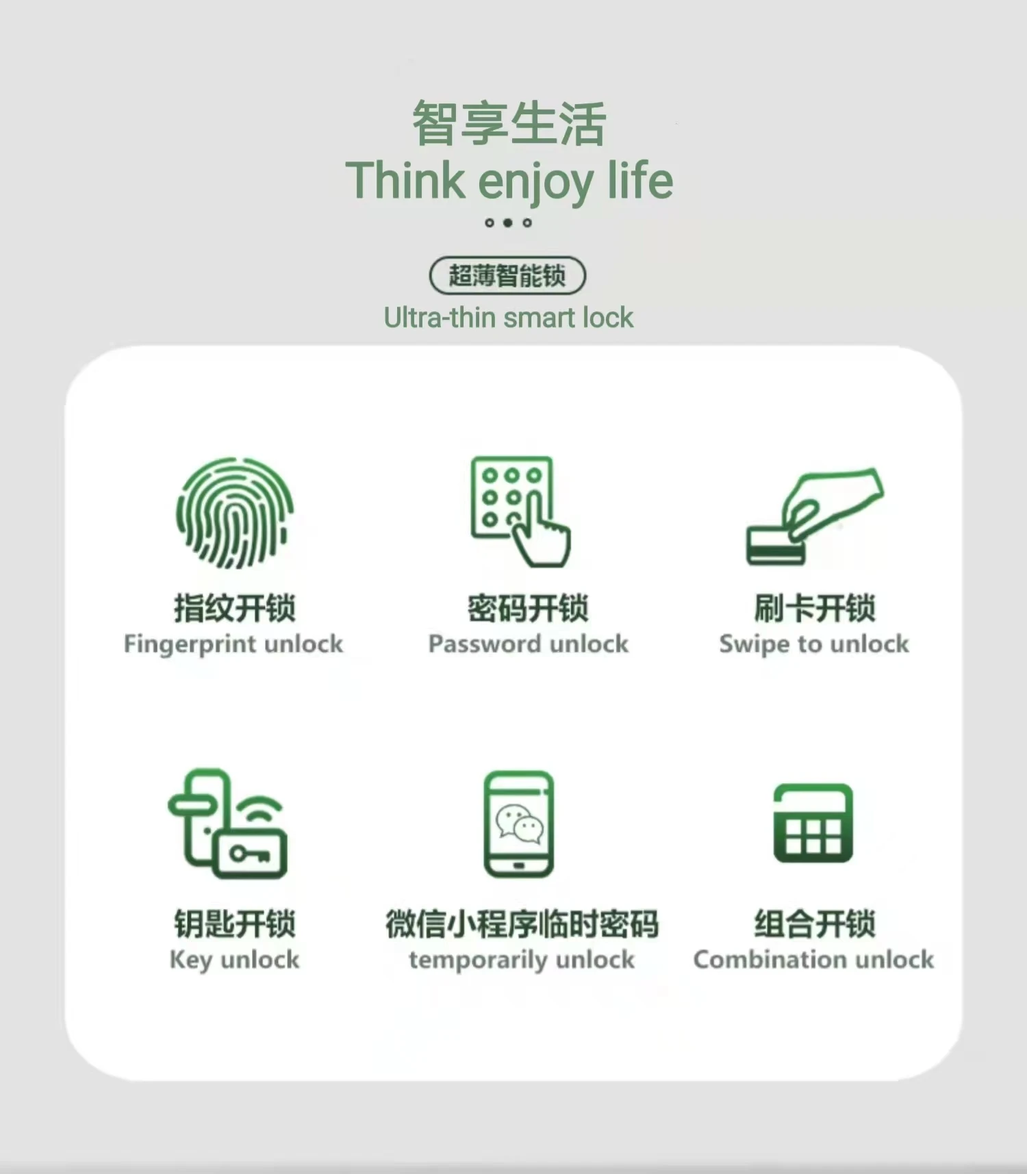 Fingerprint / Password / Smart Card / Key Unlock / App/ Temporary Password /Dual Authentication