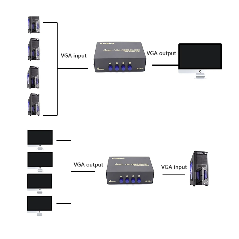 Features: 100% brand new and high quality! This is a high performance video switch splitter, which lets the signals from one computer splitted to 2/4 monitors, projectors, etc in high quality. Conveniently applied to VGA/SVGA/XGA Multisync Monitors, LCD, projector, etc in pair. Compact, light weight, portable size. Easy to install, plug and play. Powered by AC adapter. LED indicator. No software driver needed. Used for teaching showing, bond/finance/futures broadcasting and wall selling, etc. Specifications: Super far transmission distance:30m High clarity: the maximal DPI is up to 1920*1080 Bandwidth:150MHz Input:100-240V AC 50/60Hz Color:Black Size:119*75*40mm Package included: 1 x Video Switch Splitter 1 x User Manual